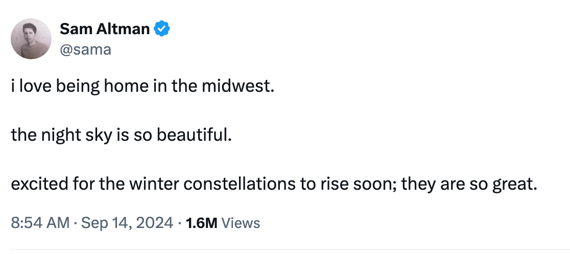 This perfectly aligns with Sam Altman’s cryptic post, saying he's “excited for the winter constellations to rise soon.” ChatGPT-01-preview suggests he's hinting at Orion, the prominent winter constellation.